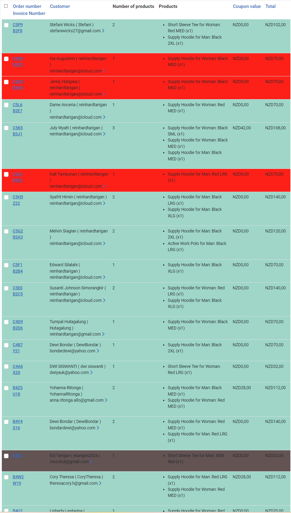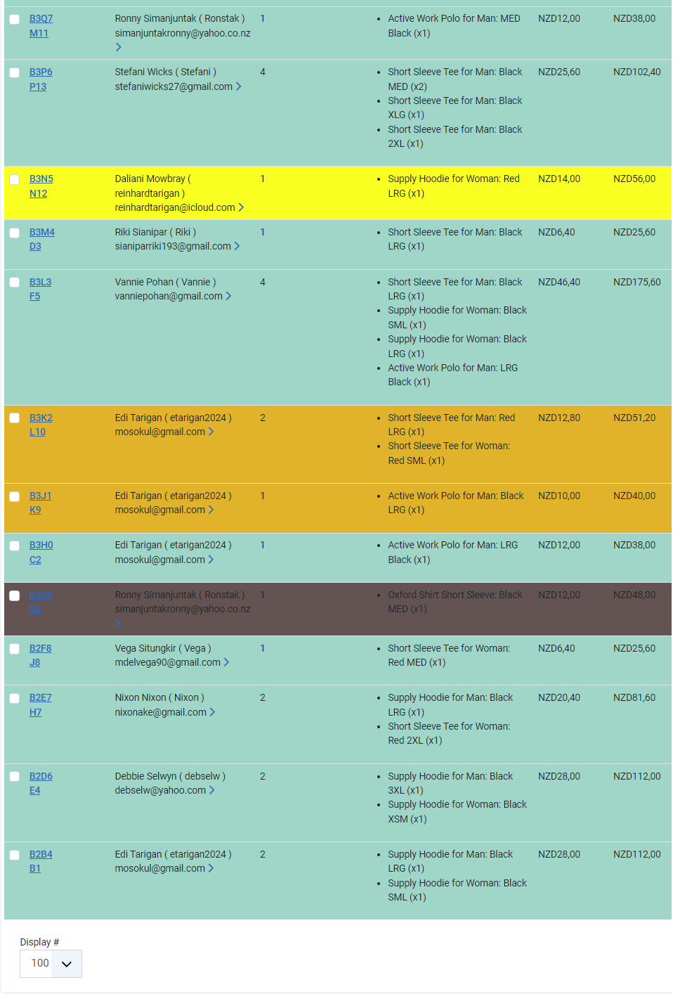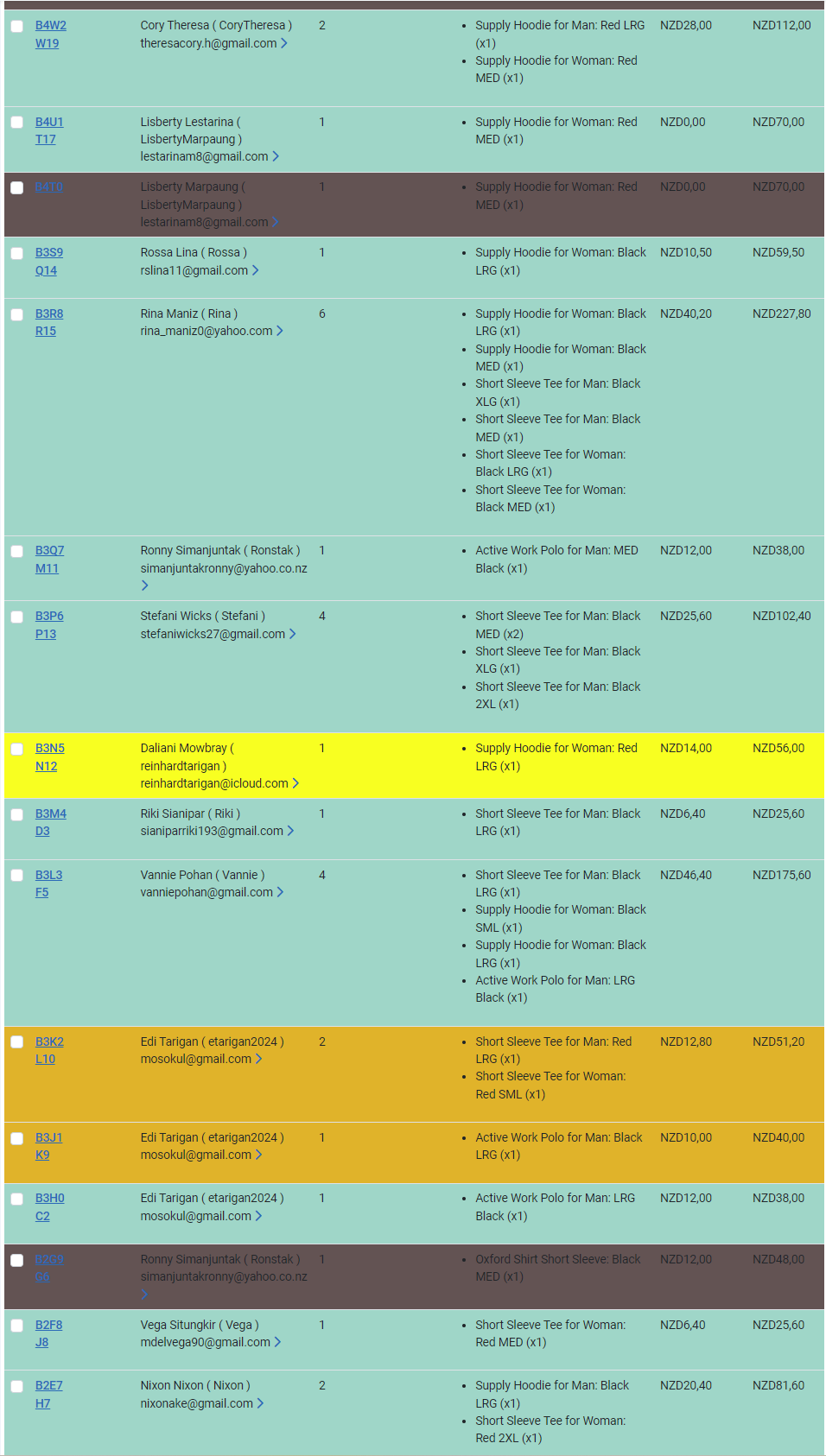 Order list sebagaimana yang tercatat dan masuk melalui Online Order Services. BPNZ tidak mengeluarkan biaya apapun untuk menggunakan fasilitas penjualan secara online ini. Semua hasil penjualan (revenue) langsung masuk ke dalam rekening. Biaya cetak kaos masih dicover oleh Edi Tarigan dan akan dibiarkan terlebih dahulu sampai ada pembicaraan dan kesepakatan dgn semua Pengurus BPNZ utk mengganti biaya pembuatan kaos.